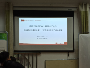 联系支部的处级干部、学校助学中心主任罗军同志在会上就自己深入学习领会习近平总书记重要讲话精神,给全体党员上了一堂主题为《习近平总书记向全世界庄严宣告:全面建成小康社会第一个百年奋斗目标已成功实现》的微党课。罗军同志就习近平总书记“七一”重要讲话精神中的全面小康内容,结合自己在重庆丰都三建乡蔡森坝村担任驻村第一书记的基层脱贫工作经历,和党员同志做了学习分享:全面小康就是全面发展的小康,是全体人民的小康,是奋斗出来的小康,中国全面建成小康社会既发展自己、也贡献世界;在驻村的616天里,他走遍了村里的431户人家,时刻贯彻工作的六大“抓手”,发挥好基层党支部的战斗堡垒和先锋模范作用,真正融入群众,为人民服务;他说实现乡村振兴,首先要做到人才振兴,这也是学习贯彻习近平总书记在中央人才工作会议上的重要讲话精神;最后他希望青年大学生能够发挥专业优势特长,融入乡村振兴,积极投身到实现第二个百年奋斗目标的新征程中去。