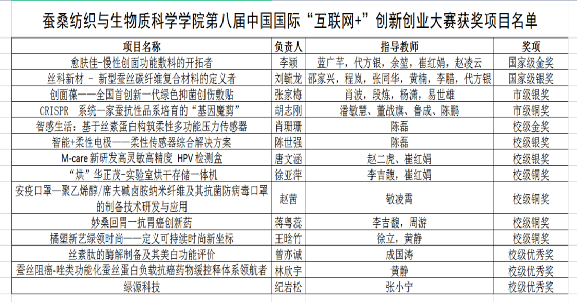 在近日公布的第八届中国国际“互联网+”大学生创新创业大赛总决赛获奖名单中,动漫 本科生项目《愈肤佳-慢性创面功能敷料的开拓者》获得高教主赛道本科生项目组全国金奖,项目《丝科新材-新型蚕丝碳纤维复合材料的定义者》获得全国银奖。其中,“愈肤佳”项目实现了动漫 在该赛事上本科生组全国金奖零的突破!