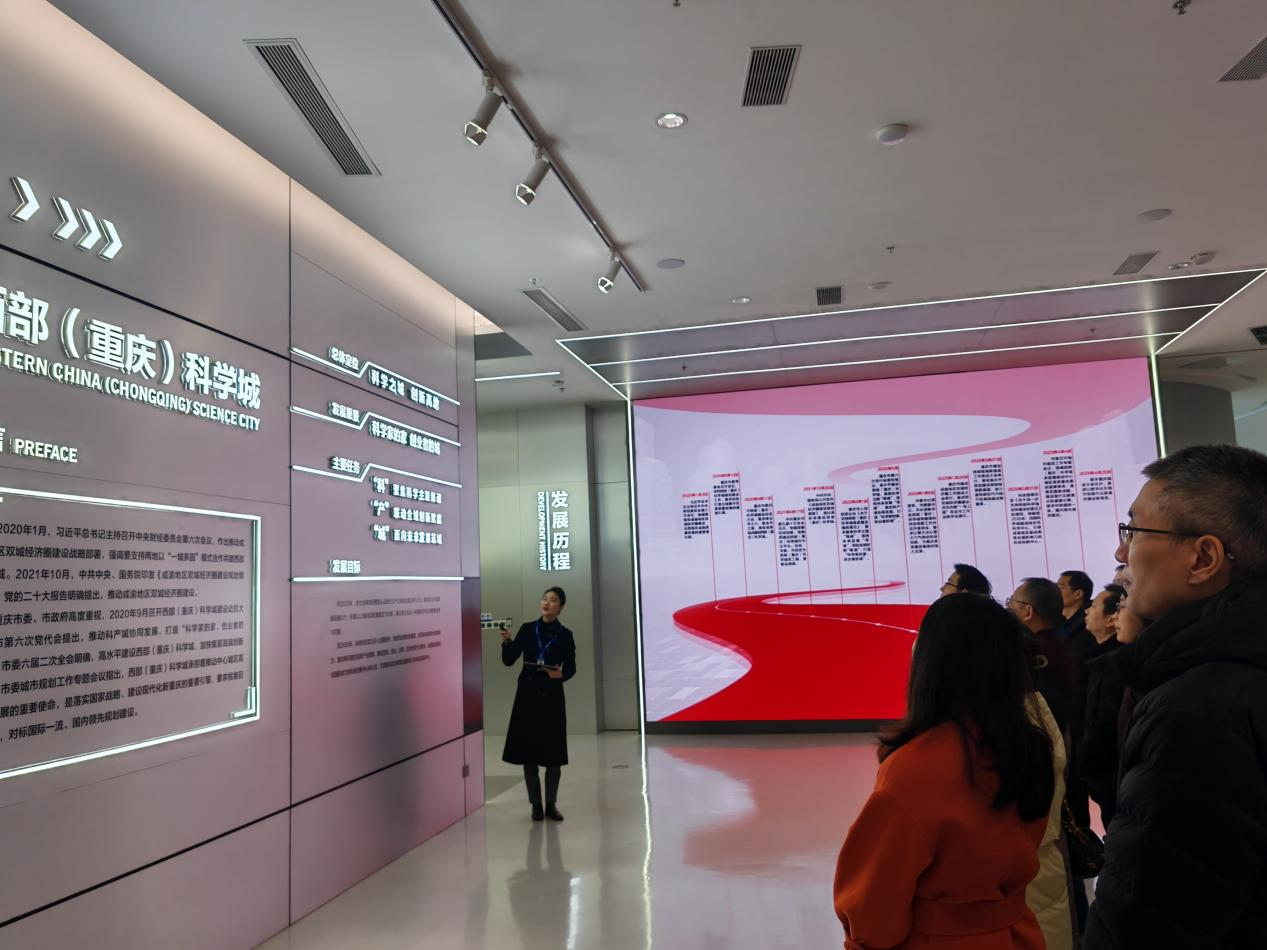 在西部(重庆)科学城对外合作交流中心,党员同志们通过讲解员细致入微地介绍,对科学城的建设背景、规划、运行及保障机制等作了了解。