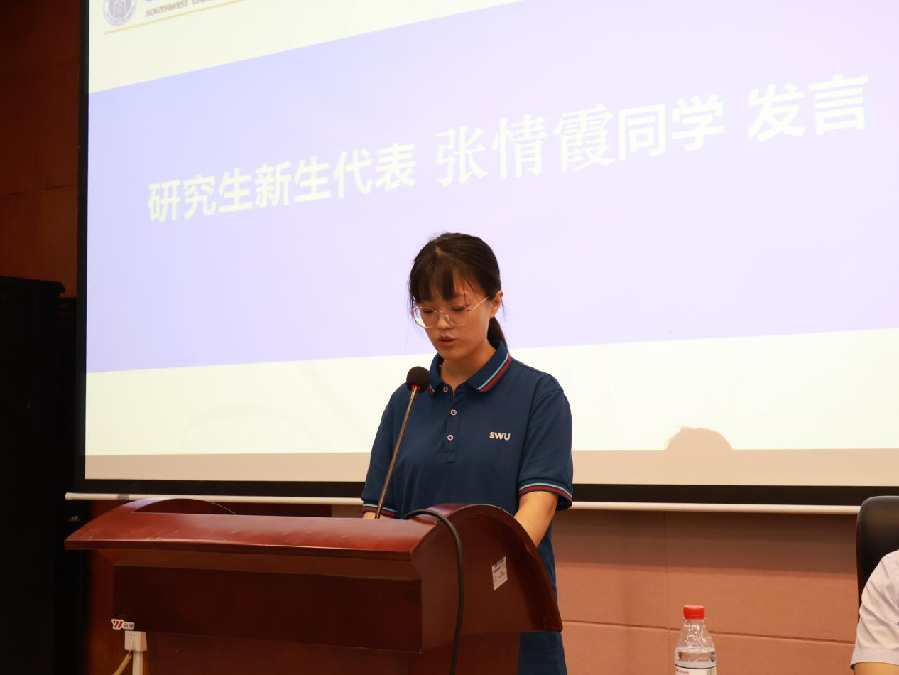 研究生新生代表,2025级博士新生张情霞同学从科研角度出发,和同学们分享了自己在以往求学路上的三点宝贵经验:做好学业规划,保持科研热情,同时关爱自己的身心健康。