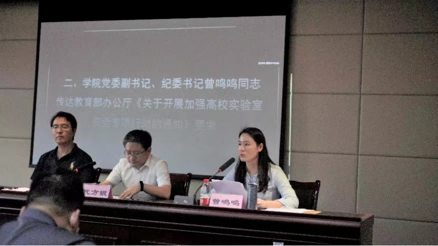学院党委副书记、纪委书记曾鸣鸣同志传达了《教育部办公厅关于开展加强高校实验室安全专项行动的通知》精神,希望通过完善责任体系和管理制度、加强教育培训和督导检查,层层压实责任,事事坚持规范,时时常抓不懈,坚决防范遏制实验室安全事故发生,保障师生健康、生命安全和校园安全稳定。