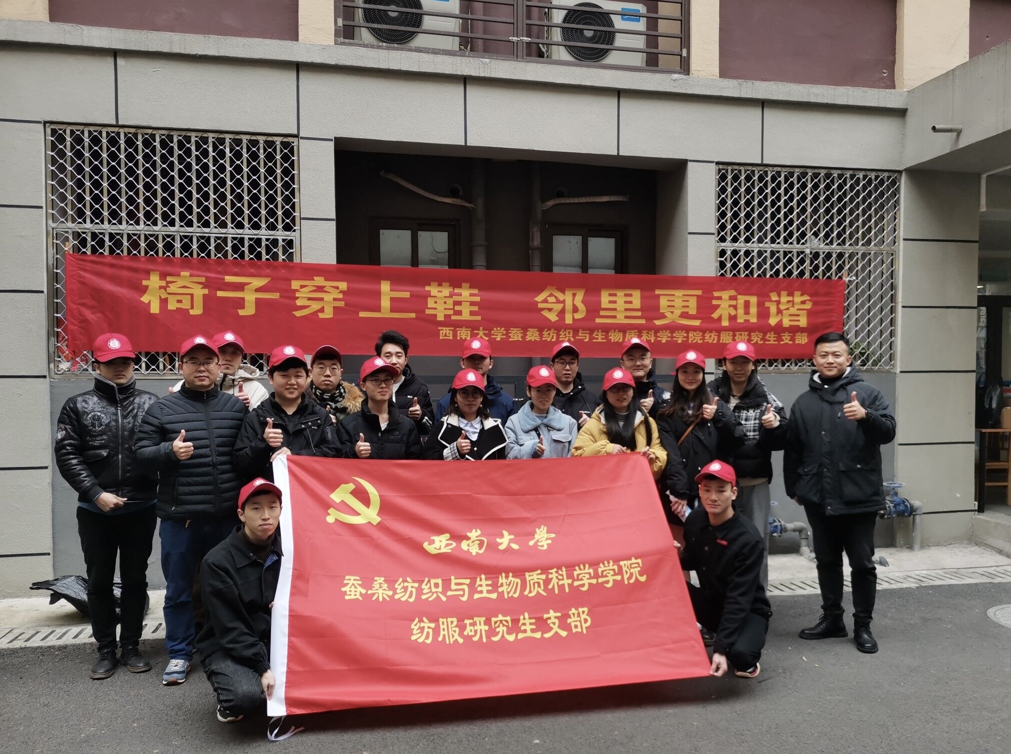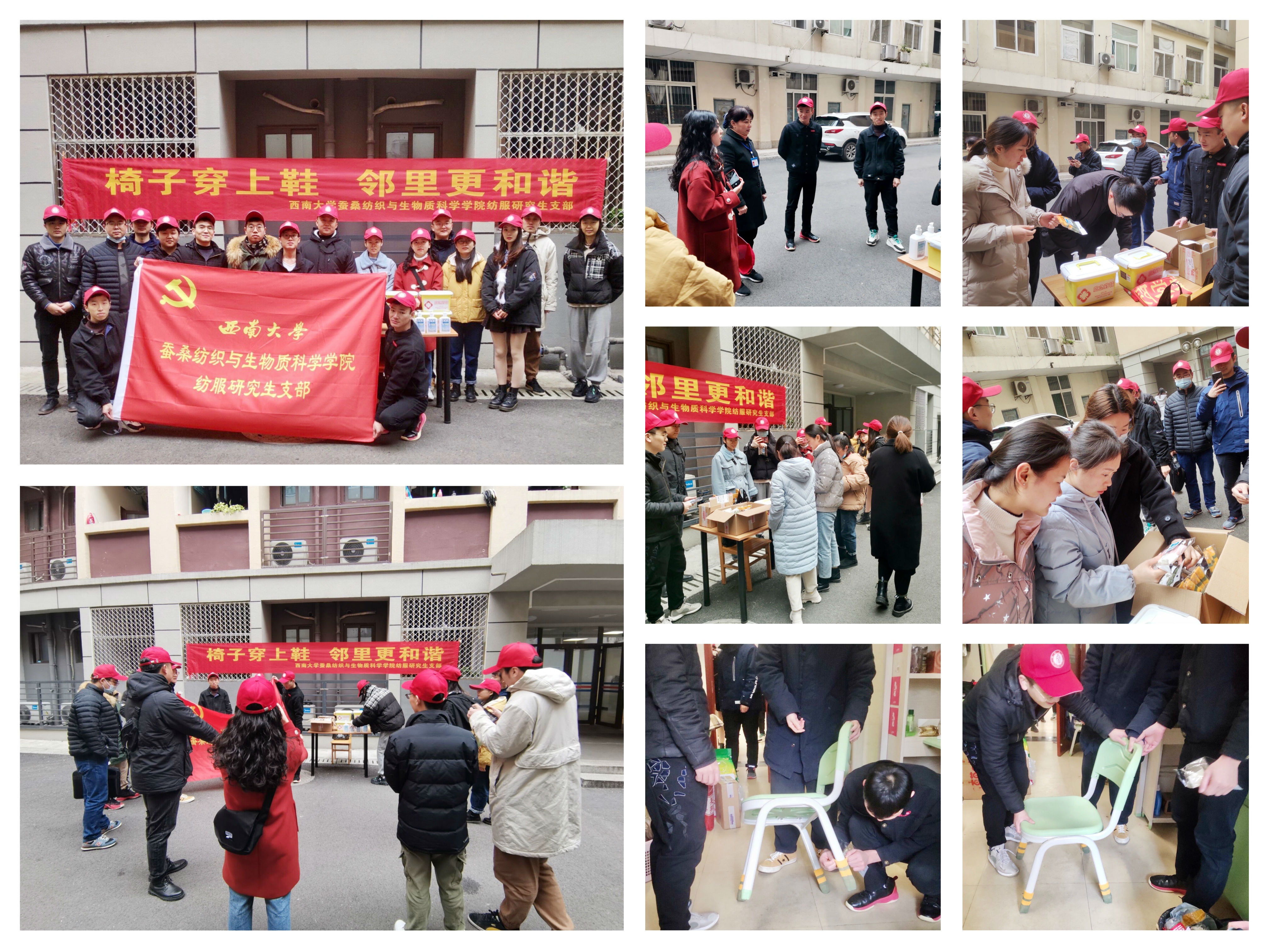 2020年12月22日,动漫 动漫 纺服研究生党支部(下简称蚕桑纺服研支部)22人在竹园宿舍园区开展了“五个一”系列主题党日活动,活动分“椅子穿上鞋,邻里更和谐”园区服务活动和公益活动两个环节开展。支部全体党员同志参加了本次活动,活动由蚕桑纺服研支部书记余堃组织。