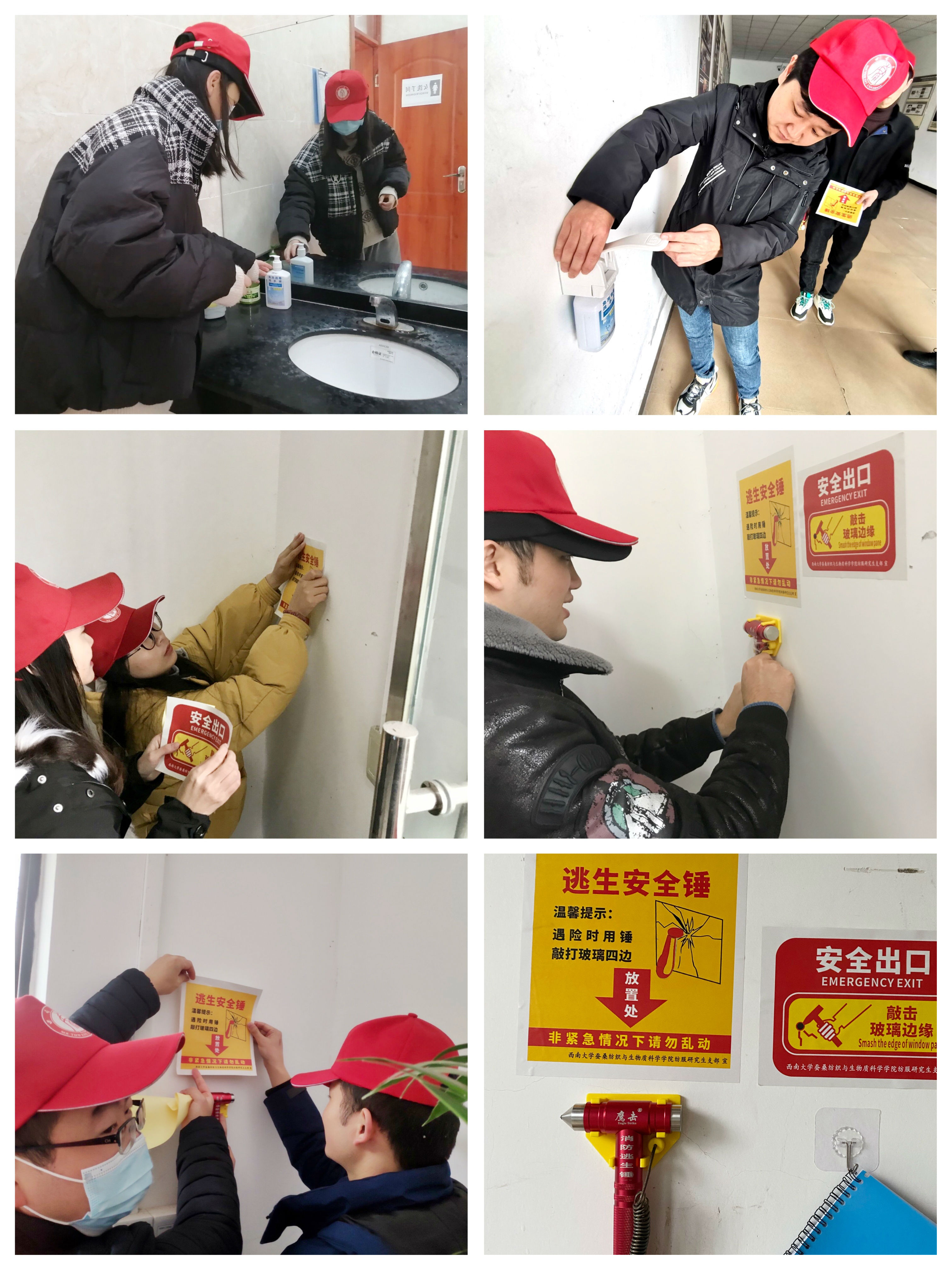 随后,支部党员前往33、45和48教学楼开展公益活动。在教学楼卫生间、进门处放置医用免洗消毒洗手液,培养个人卫生习惯,提高疫情防护意识。同时在45和48教学楼玻璃门处安置消防安全锤,并分享和宣传了安全锤的正确使用方法,目的是预防突发情况,在危急时刻打开生命通道。