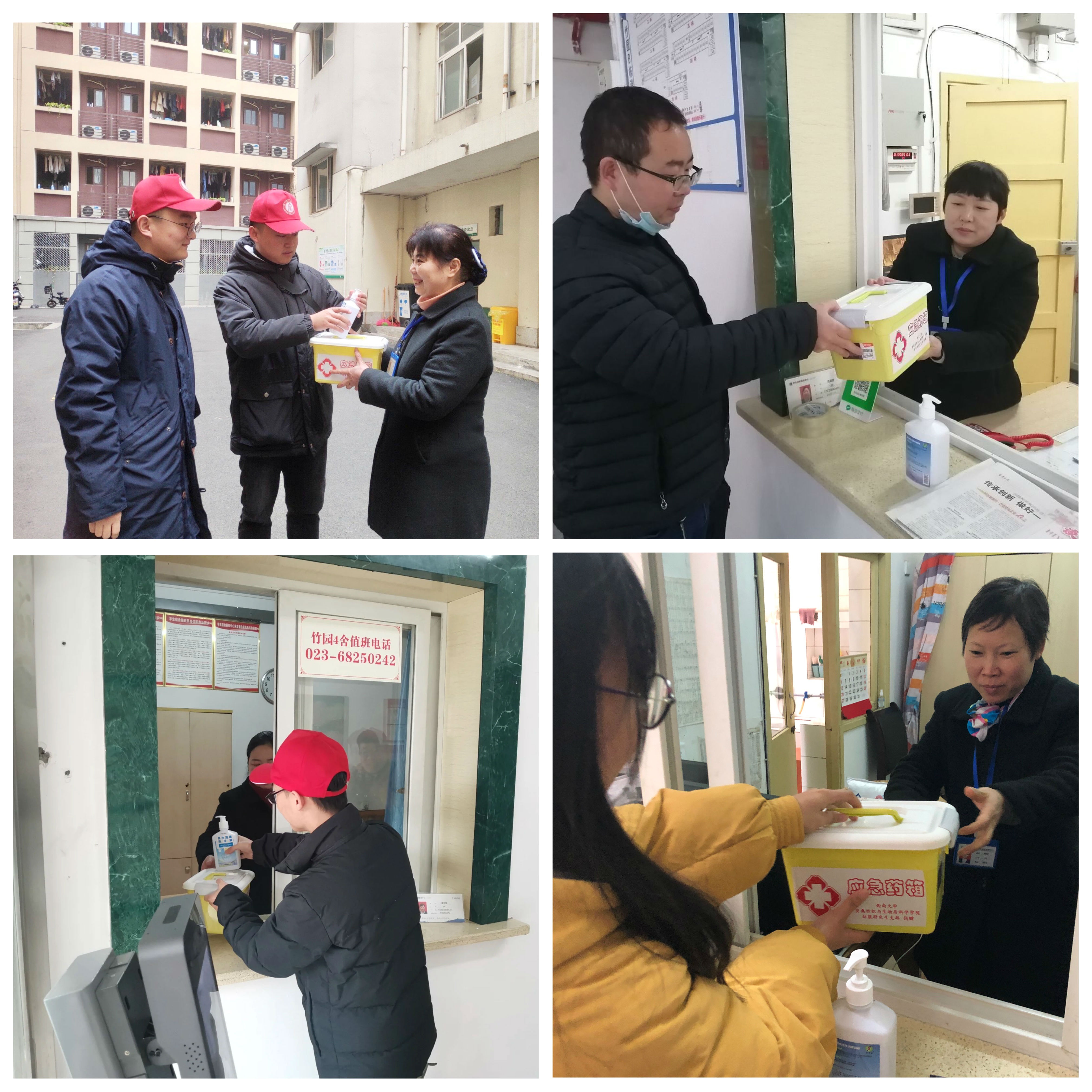 支部首先来到竹园宿舍园区,向宿舍楼宿管阿姨捐赠应急药箱和免洗消毒洗手液。药箱里包含纱布、口罩、温度计、止血绷带、烫伤膏等急救物品,在遇到学生突发意外情况时,可以帮助宿管阿姨及时应急处理。