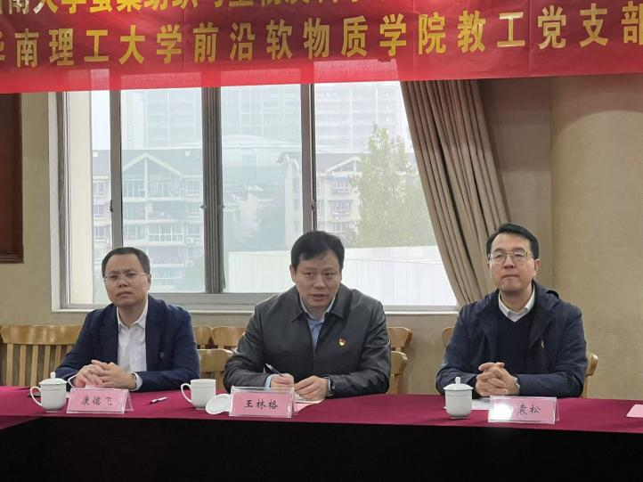 华南理工大学前沿软物质学院教工党支部书记王林格教授介绍了该党支部的人员组成、党建工作特色及成效。他指出开展本次结对共建党支部活动,有助于进一步深化双方党支部交流合作,通过高质量党建活动赋能高质量人才培养体系和学科发展结构建设,实现党建与事业融合发展。