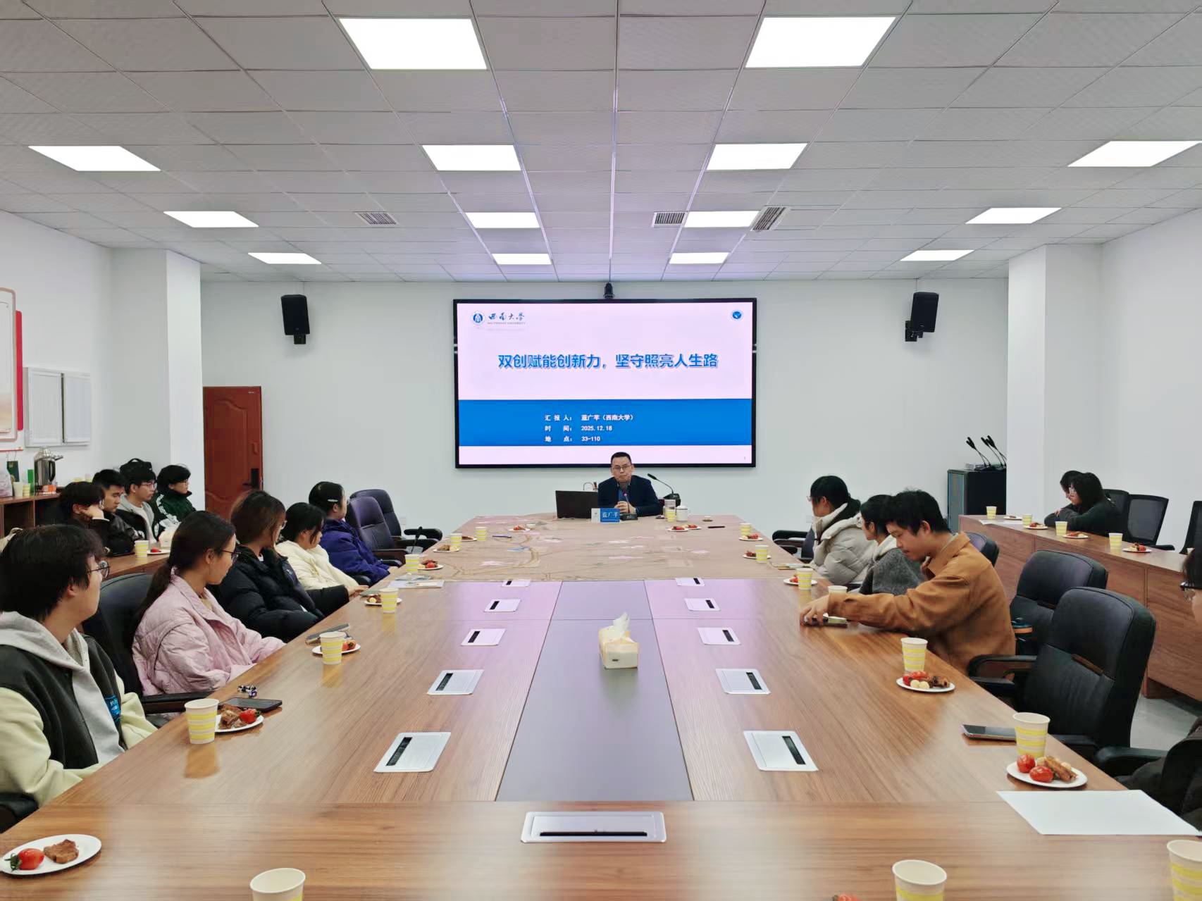 发布时间: 2025-12-31 09:01:55 已阅读:12月18日,学院党委在33教110会议室举办了第十六期“驼铃茶语”党建品牌活动,本期主题为“双创赋能创新力,坚守照亮人生路”。活动特邀动漫 副院长、全国高校“双带头人”教工第四党支部副书记蓝广芊教授担任主讲嘉宾,吸引了学院众多对创新创业与科研实践充满热情的学生积极参与。