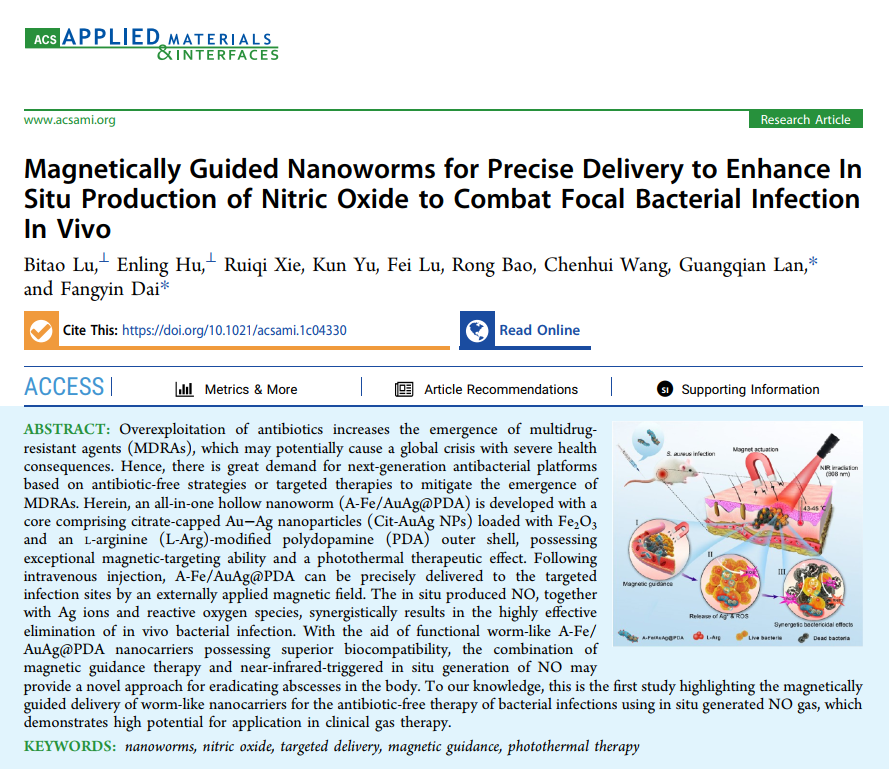 发布时间: 2021-06-02 18:25:01 已阅读:近日,动漫 Bio-road生物医用材料研发团队在材料领域知名期刊《ACS Applied Materials & Interfaces》(影响因子:8.758) 上发表题为“Magnetically Guided Nanoworms for PreciseDelivery to Enhance In Situ Production of Nitric Oxide to Combat FocalBacterial Infection In Vivo” (磁介导纳米蠕虫精准递送一氧化氮治疗体内细菌感染) 的研究论文。该成果报道了一种具有核壳结构的蠕虫状递送系统,实现磁响应、近红外响应的光热动力学、化学动力学及NO气体高效协同抗菌,为体内细菌生物膜的治疗提供了一种新型的非抗生素基靶向治疗策略。