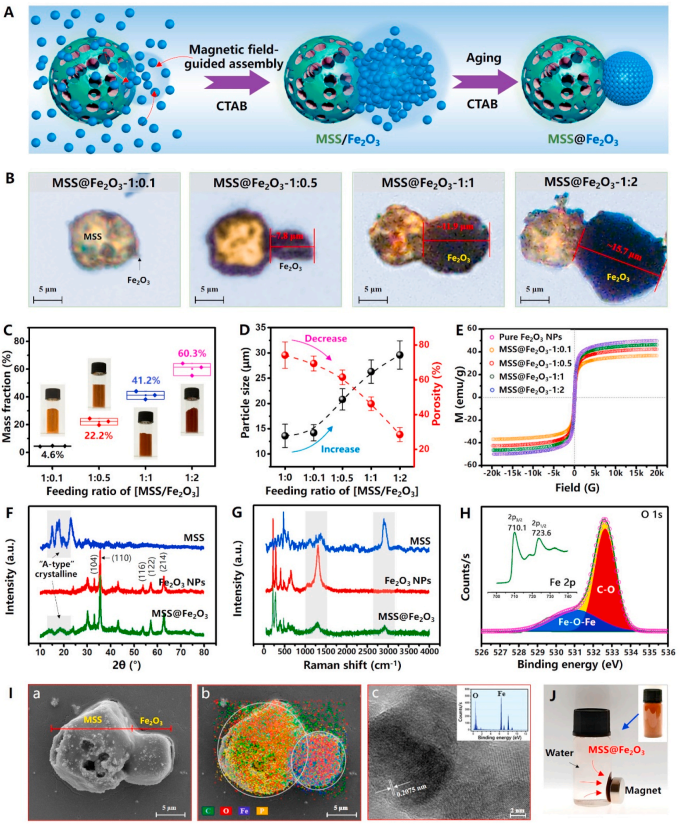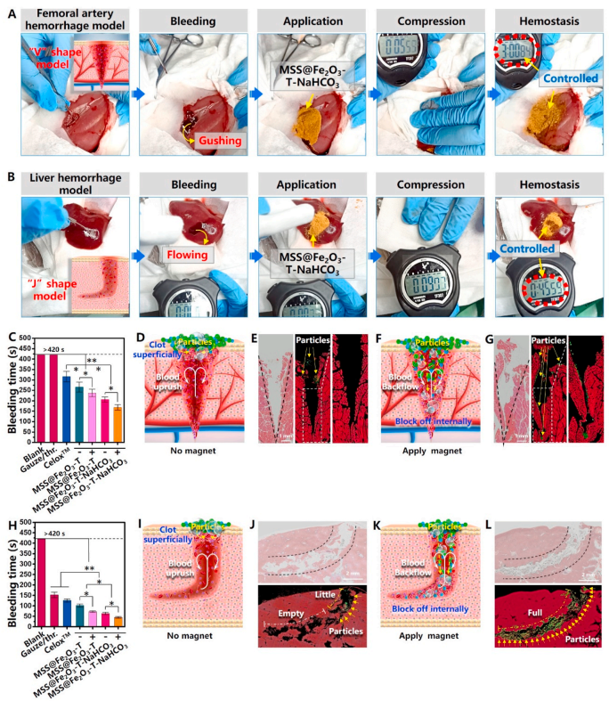 目前,许多研究对于伤口出血的控制策略聚焦于出血伤口表面封盖,力图利用止血材料在其与出血伤口表面之间形成凝血栓塞以实现出血控制,然而往往因为凝血过程无法涉及深型和复杂型出血腔导致控制失败。该研究针对贯穿型和弯曲型出血创口,首次提出一种磁介导驱动止血粒子深入出血腔体,在隐蔽复杂的出血位点原位诱发“凝血瀑布”实现由内至外的立体式止血策略。在该研究中,通过单向生长法在具有高表面负电位微孔淀粉单侧生长磁性纳米Fe2O3聚集体构建得到具有磁介导驱动功能的Janus微粒载体,负载固定凝血酶及碳酸氢钠后复合质子化氨甲环酸可获得具有自分散功能的止血粒子。
