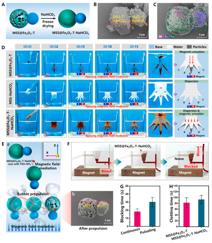在实施止血控制时,该止血粒子首先在外加磁场控制下深入伤口出血点。到达出血腔深处后,该止血粒子中碳酸氢钠壳层与质子化氨甲环酸在血液中迅速反应立即生成CO2气泡。借助气泡驱动力,可实现载药微孔淀粉向伤口深处出血点的快速扩散以充分覆盖出血点,借助其自身凝血机制原位诱发“凝血瀑布”效应,促进凝血栓塞在伤口内部快速形成,从而完成在伤口深处实现“立体式”止血。该工作为止血材料领域中设计定向功能化结构,构建载送药物驱动力模型及研发快速有效止血材料提供了可靠的依据和新的思路。