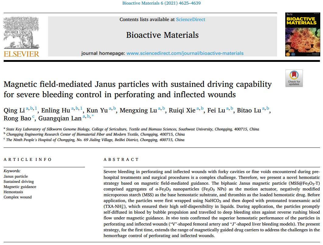 发布时间: 2021-06-28 10:27:35 已阅读:近日,动漫 Bio-road生物医用材料研发团队在材料领域知名期刊《Bioactive materials》(影响因子:8.724)上发表题为“Magnetic feld-mediated Janus particles with sustained driving capability for severe bleeding control in perforating and inflected wounds”(一种用于控制贯穿及弯曲创口大出血的磁介导Janus止血粒子)的研究论文(DOI: 10.1016/j.bioactmat.2021.05.006)。该成果报道了一种利用磁力靶向介导能力驱动止血微粒深入伤口,通过酸碱反应产生气泡实现微粒自分散充分覆盖出血点,从而在隐蔽复杂的出血位点原位诱发“凝血瀑布”实现由内至外的立体式止血策略。