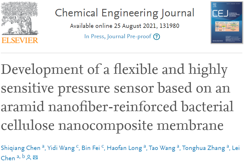 发布时间: 2021-09-05 10:43:15 已阅读:近日,动漫 陈磊副教授课题组在化学工程领域知名期刊《Chemical Engineering Journal》(IF:13.273)上发表题为“Development of a flexible and highly sensitive pressure sensor based on an aramid nanofiber-reinforced bacterial cellulose nanocomposite membrane”的研究论文。