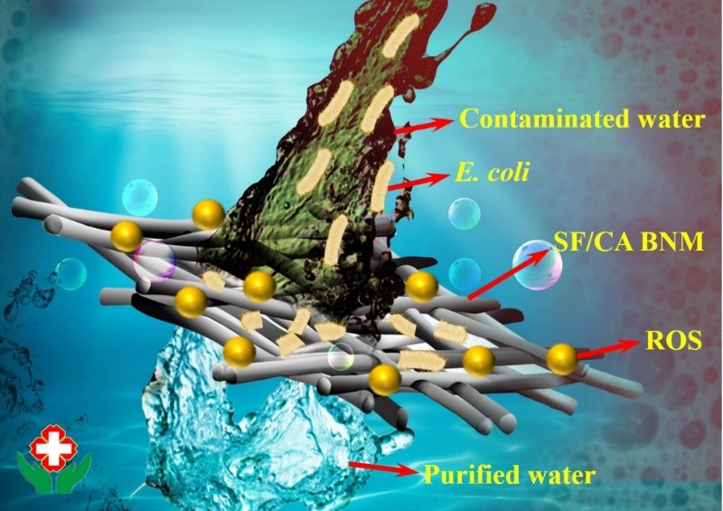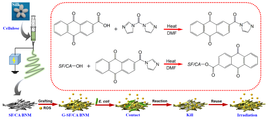 由水污染导致的人类健康问题近些年来引起广泛重视,病原微生物污染作为水环境问题之一和人类健康息息相关,极可能导致人类肠道感染和各种传染病大面积爆发。大肠杆菌是目前数量最多的一种寄生于人和动物体内的细菌,通过饮用水或生活用水,直接或间接影响人类生命健康和生活品质。针对传统光抗菌材料在黑暗条件下会失去抗菌功能,本研究采用静电纺丝技术将醋酸纤维素与丝素进行混纺,将其作为载体与蒽醌类有机光敏剂进行复合,开发出一种可高效、全天候杀灭细菌的纳米生物质材料。该材料耐用性和透气性好,与纯丝素纳米纤维膜相比,力学性能得到较大提升,同时解决了传统无机光敏材料如二氧化钛等与有机高分子载体之间结合力较弱的问题,更为重要的是该材料可以像太阳能电池一样,在光照下产生抗菌活性,利用有机光敏剂的特定结构,在光照激发条件下发生分子结构重排,将抗菌活性存储起来,并在黑暗条件下缓慢释放。这一纳米纤维材料仅150纳米左右的细小直径不仅能有效拦截细小病菌,同时还增大了光抗菌反应的接触面积,通过产生杀菌活性氧成分,快速破坏细菌膜结构,在光照下,可在较短时间内杀灭大肠杆菌达99.99%以上。目前,该研究团队正准备开发基于纳米纤维和无纺布多层复合的抗菌产品,提升现有防护用品的性能。