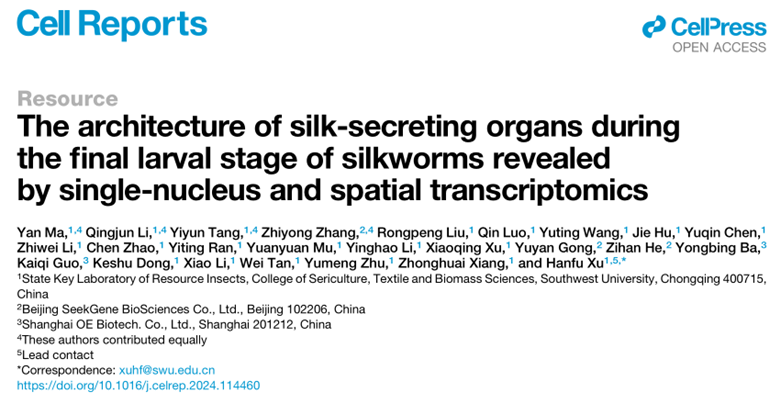 2024年7月10日,国际知名学术期刊Cell Reports(Cell旗下子刊)在线发表了资源昆虫高效养殖与利用全国重点实验室徐汉福教授课题组完成的大蚕期家蚕(4~5龄幼虫)丝腺时空生物学研究论文。该研究首次绘制了高分辨率的大蚕期丝腺全景时空转录图谱,并以此为基础解析了大蚕期丝腺的细胞类型、细胞状态及其基因表达的动态变化,精准定位并揭示了丝腺细胞群的空间位置与空间异质性。