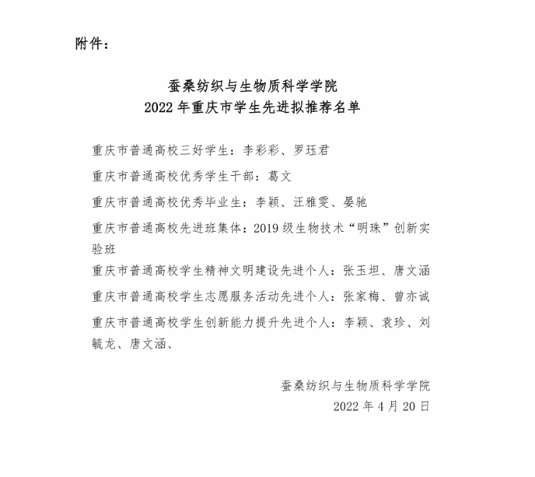 根据《动漫 关于开展2022年重庆市高校学生先进评选活动的通知》文件要求,按照学生自愿申请、学院评优评奖工作小组综合评选、学院党政联席会审核评定等工作程序,形成《动漫 2022年重庆市学生先进拟推荐名单》,现予以公示。