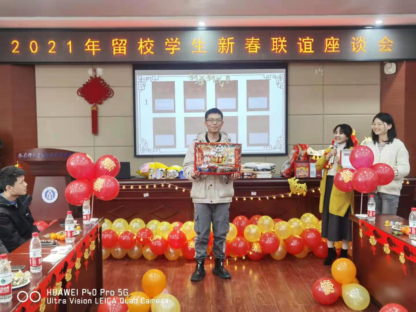 联谊座谈会在一段特殊的新春祝福视频中拉开序幕:学院领导和老师们送上新春的问候和祝福,远在家乡的亲人们也表达了对留校学生的思念。“女儿,这是你20年来第一次没有在家过年,爸爸妈妈都很好,不必挂念。”“孩子,你为了自己的学业而努力,不能回家,希望今后的你再接再厉,成为国家的栋梁!”“今年爸爸妈妈不在身边,相信你和老师、同学们也会度过一个愉快的新年!”……疫情阻碍了回家的脚步,却隔不断亲人团圆的企盼,“云拜年”形式,让学子们异乡过年也团圆。